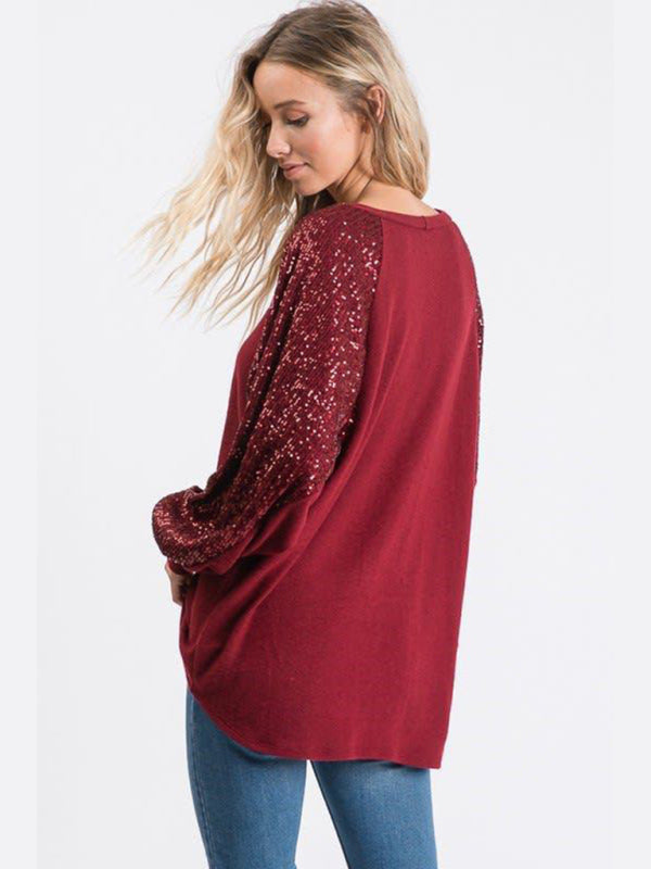 Sequin Stitching Women's Round Neck Loose Raglan Sleeve Fashion Top