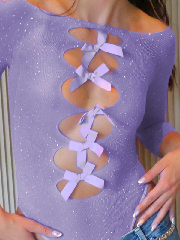 Women's new sexy hot girl high elastic knitted see-through bow hollow hot diamond jumpsuit