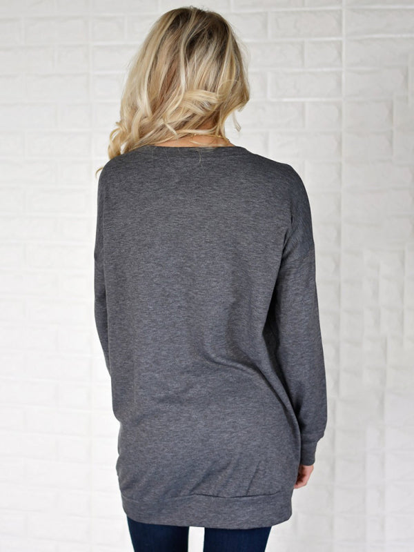 Women's Round Neck Batman Long Sleeve Pocket Solid Color Loose T-Shirt